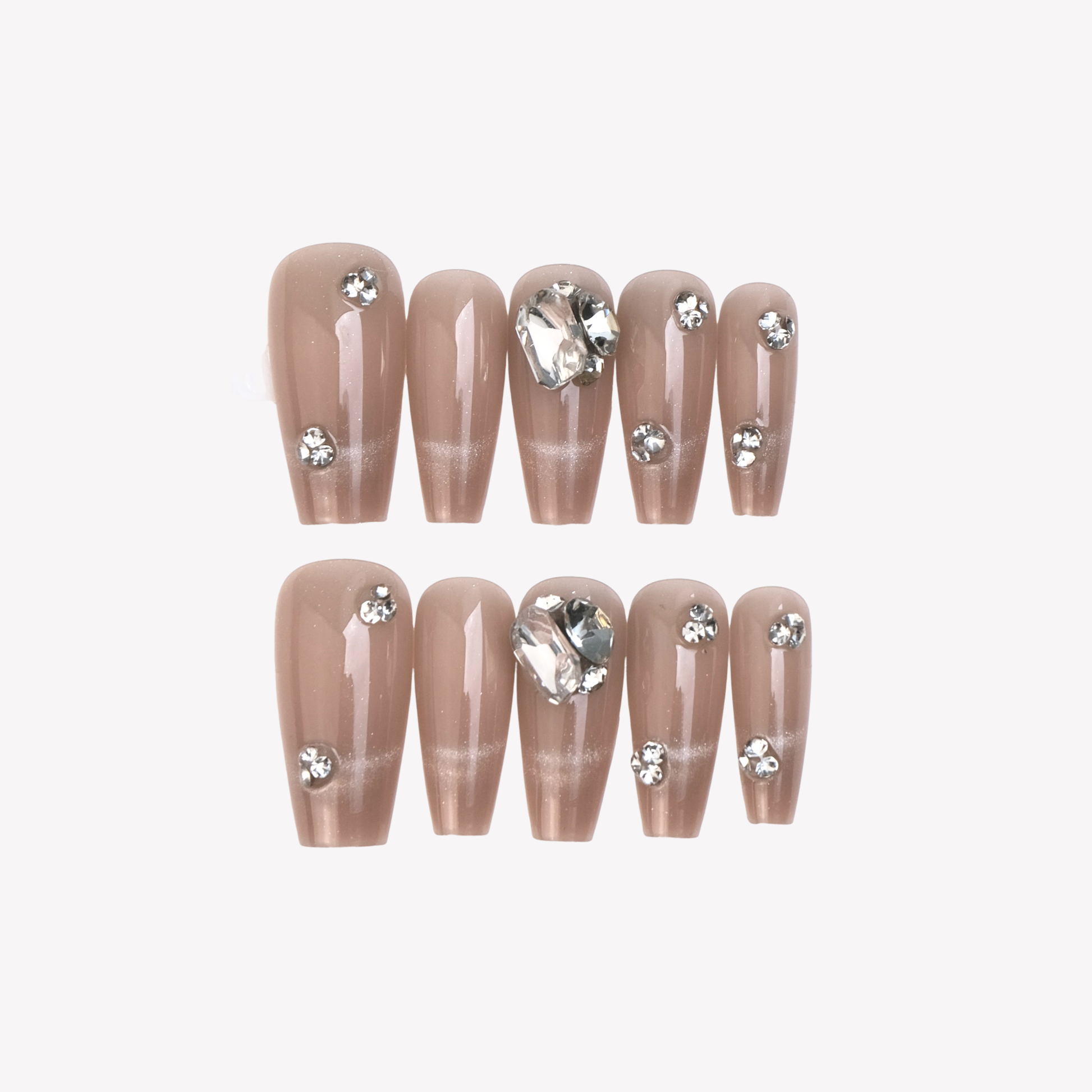 A sheer nude-beige base finished with a soft cat eye tip. Minimal crystal placements and a single oversized gem.
