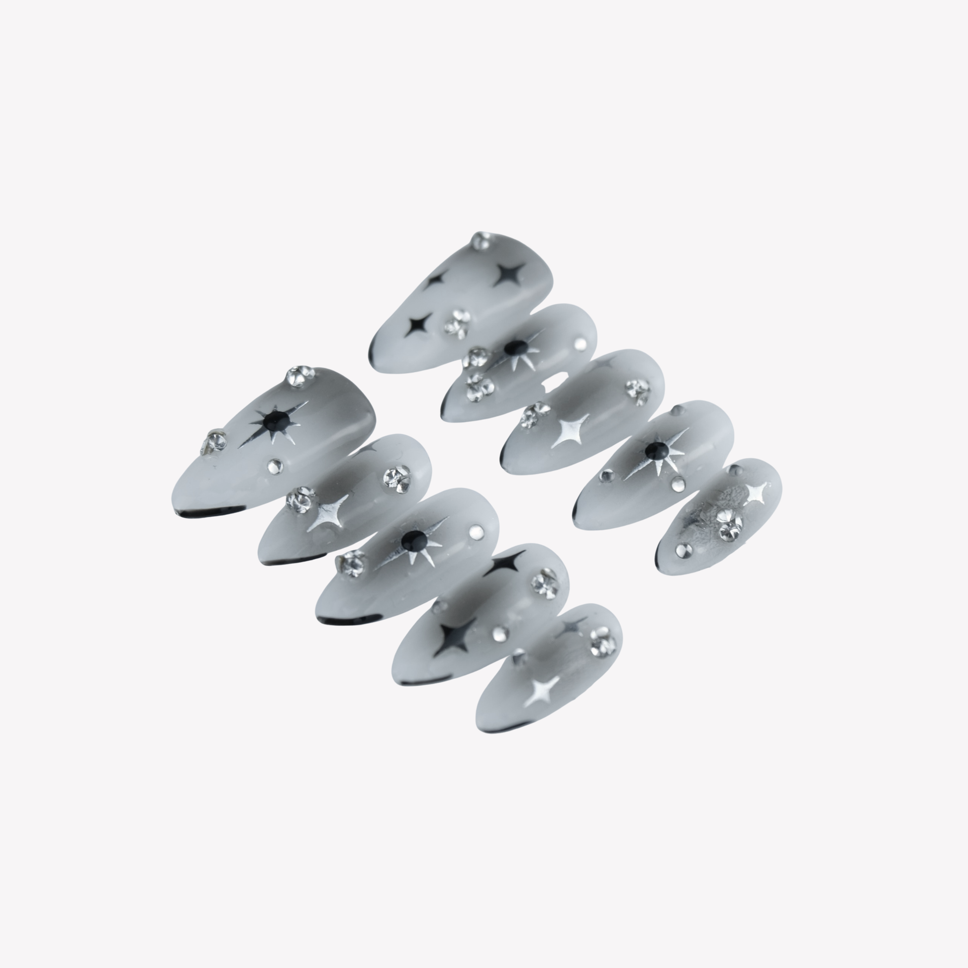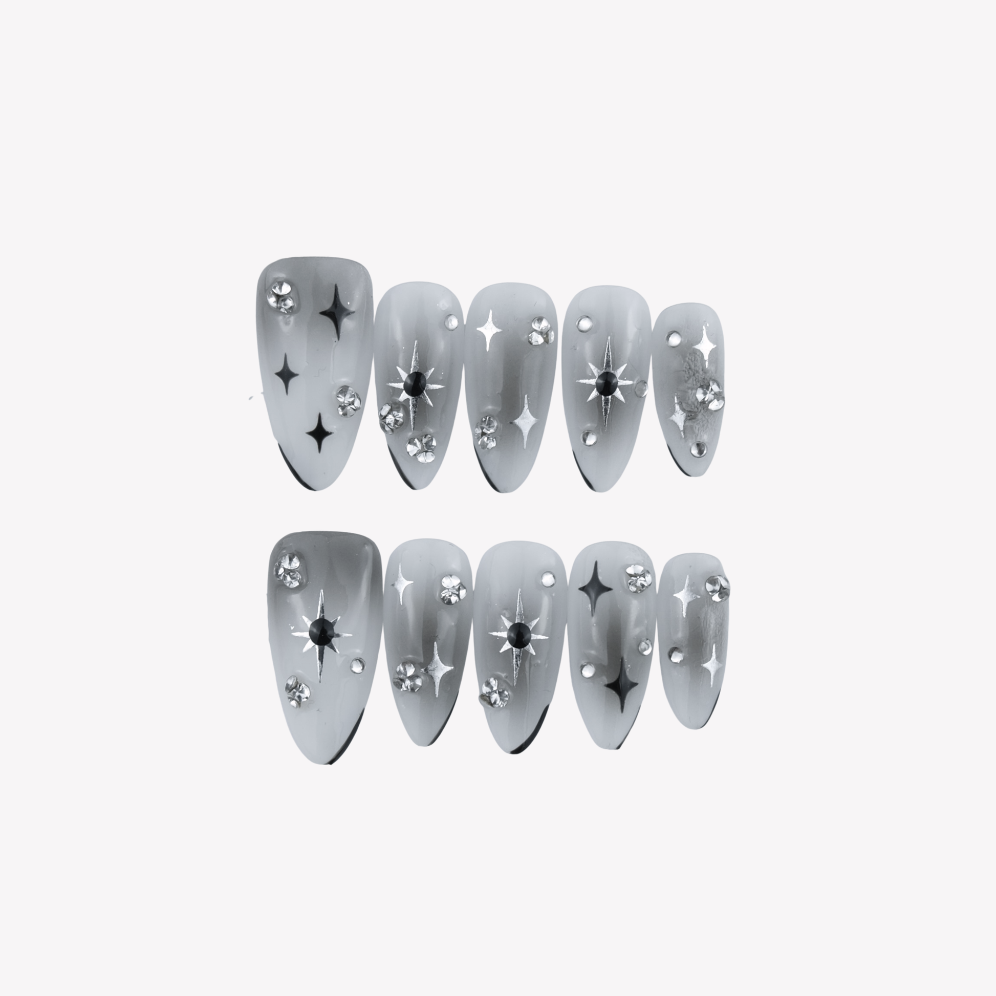 Cool grey nail set featuring star motifs, crystal accents, and subtle metallic detailing with a smooth, glossy finish.