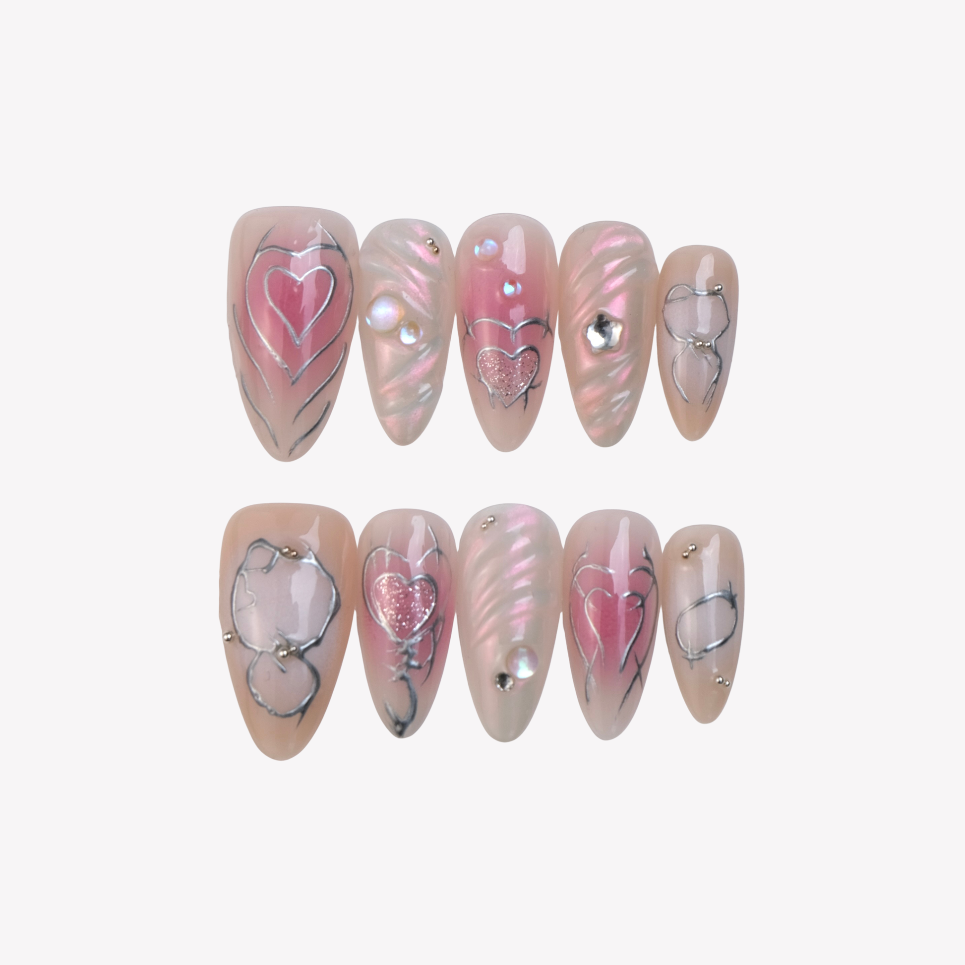 A sheer blush base with silver heart outlines and pearlescent highlights.