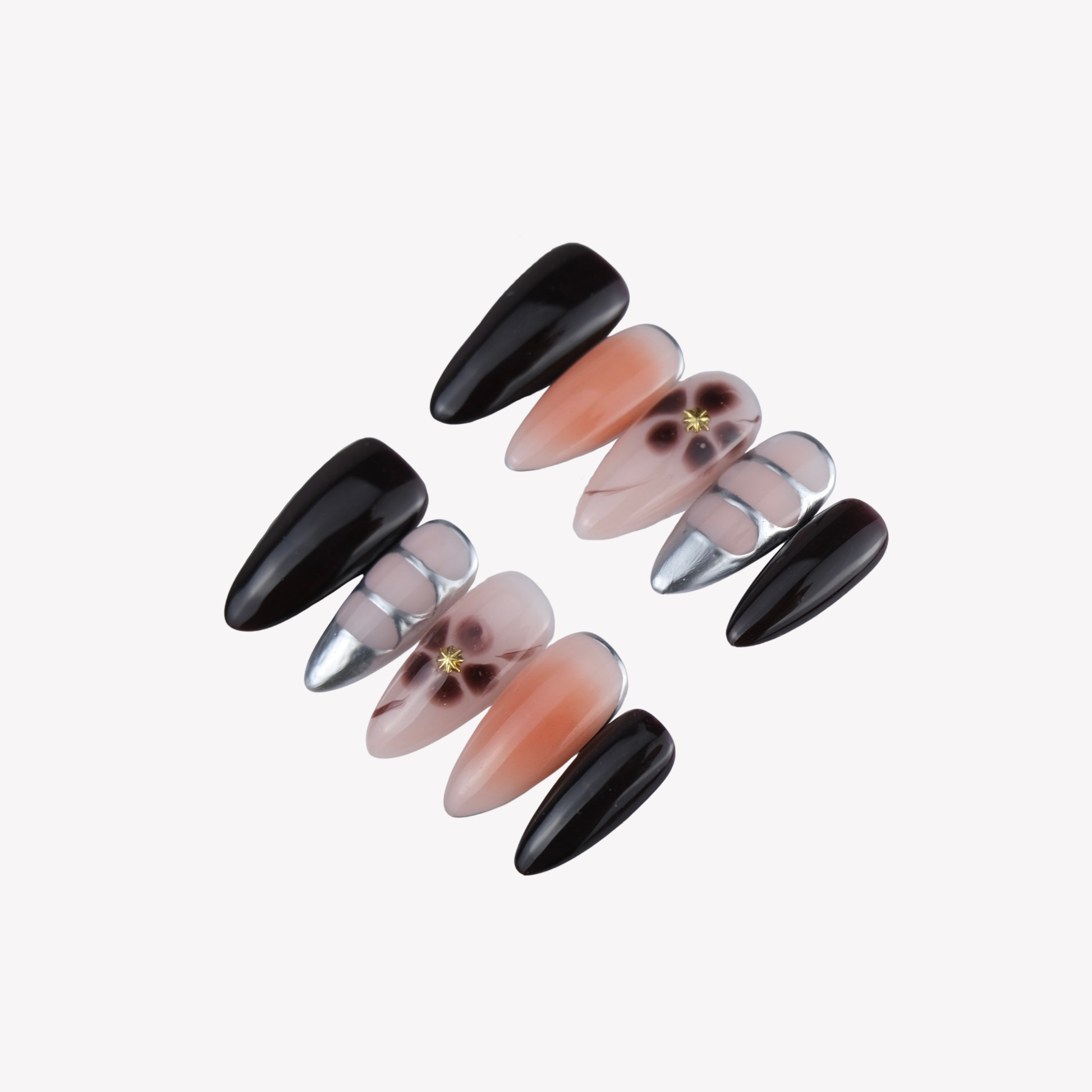 A moody nail set blending deep black, soft nude gradients, and smoky floral accents, finished with silver chrome detailing and a subtle gold-centered bloom.