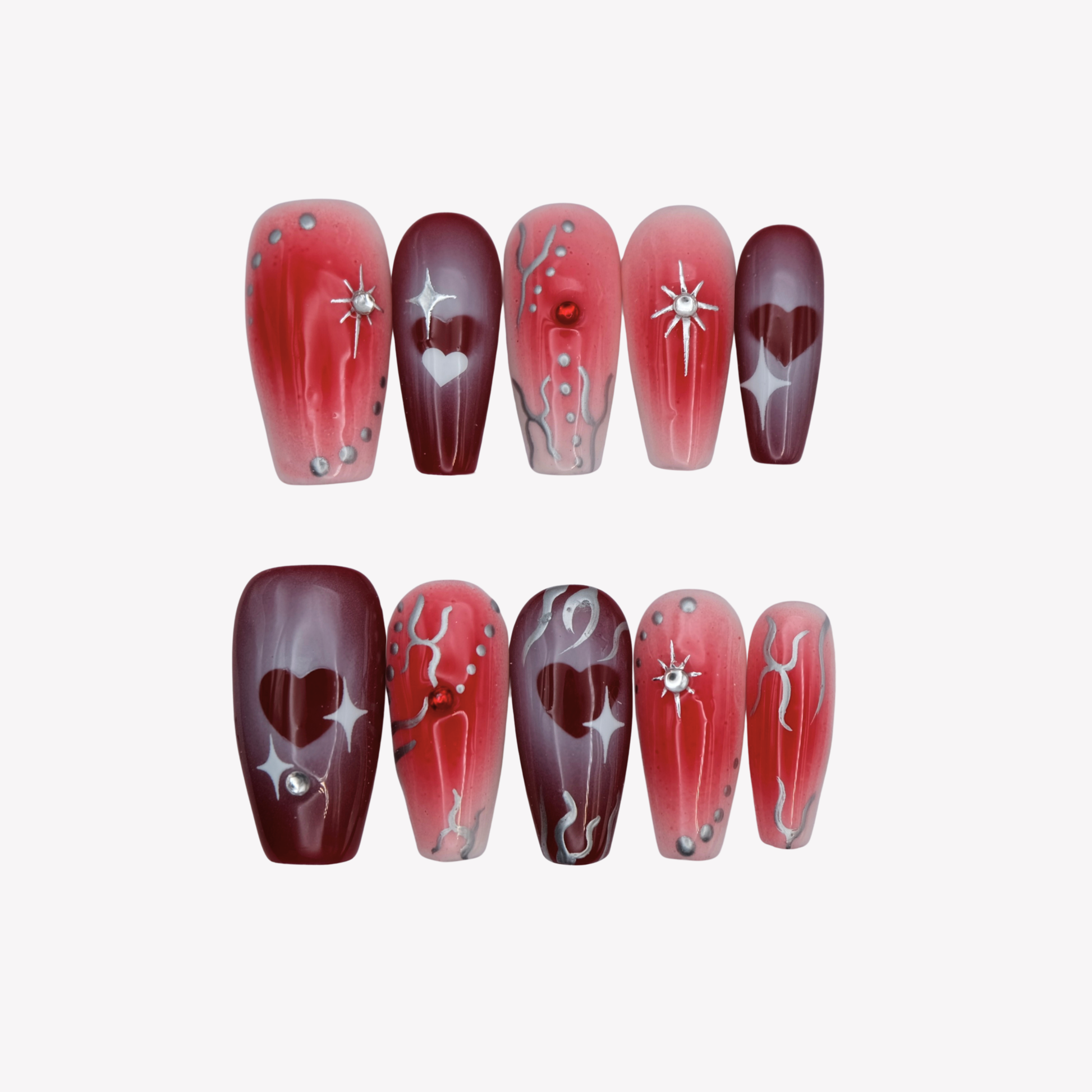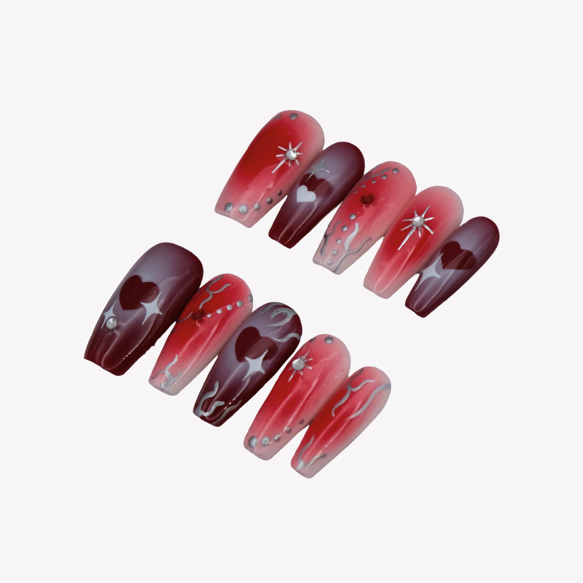 Red gradient nail set with heart motifs and silver detailing.