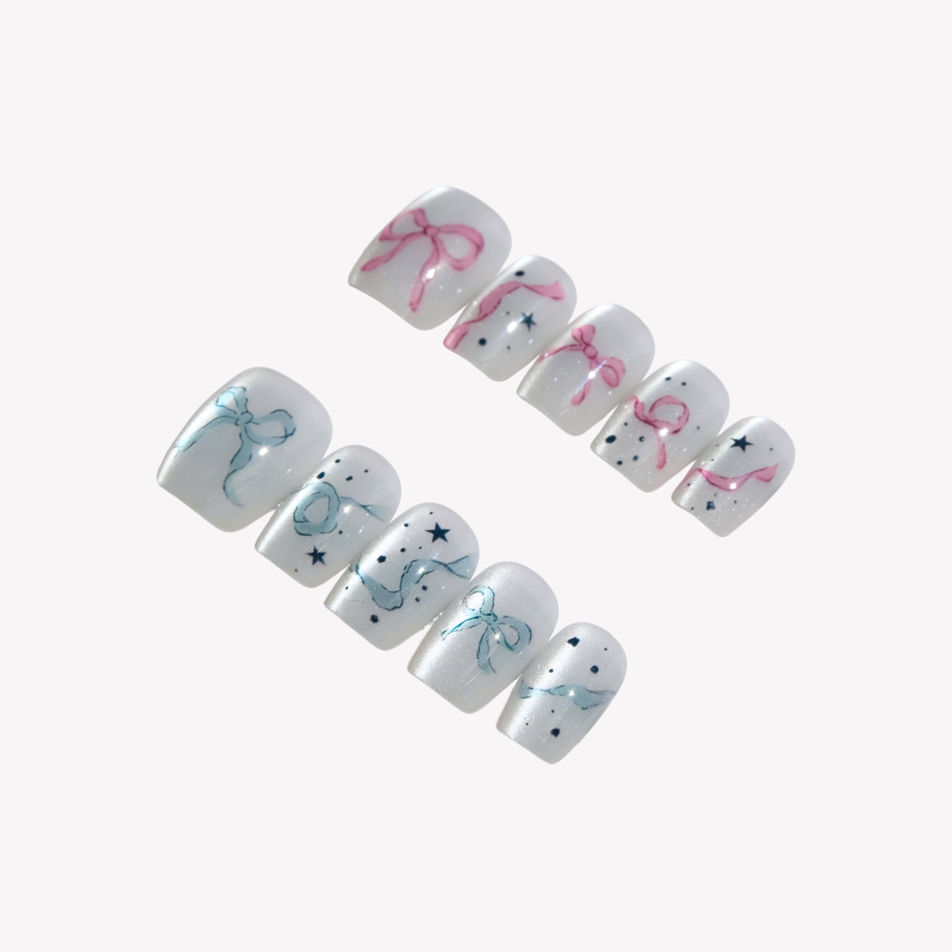 Pearl-finish nail set featuring pastel ribbon motifs, star accents, and a soft shimmering base.