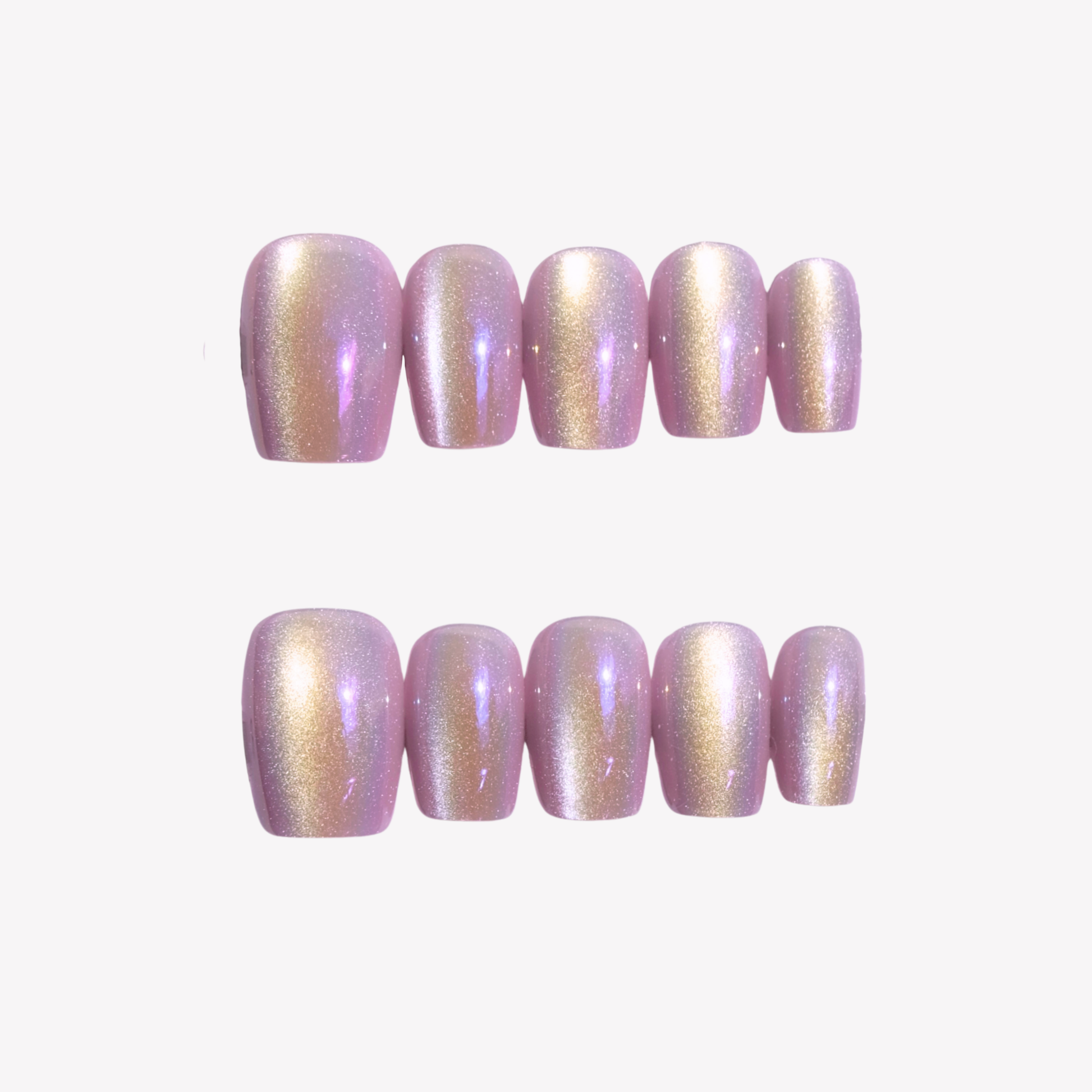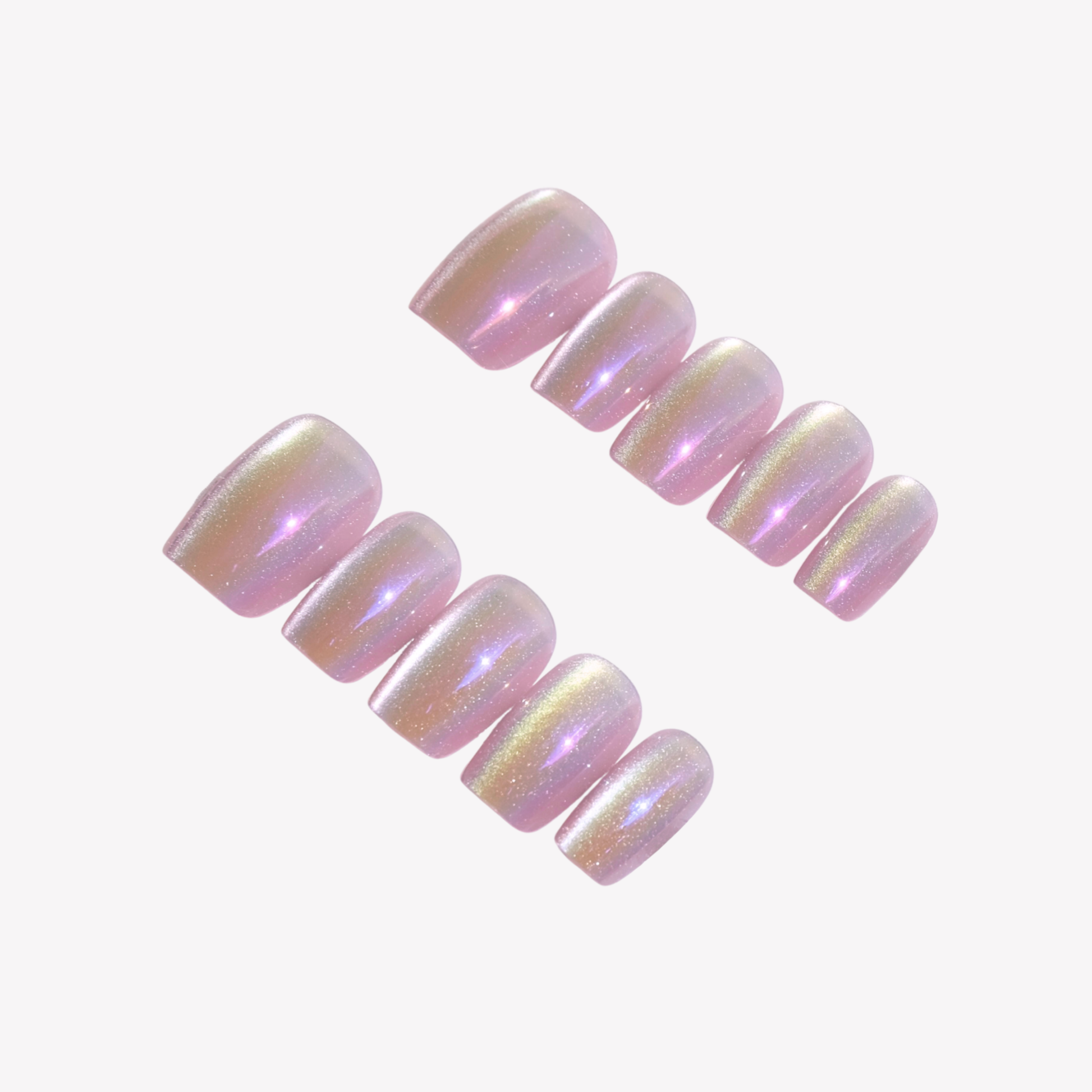 Soft pink nail set with a pearlescent shimmer finish and subtle iridescent reflection.
