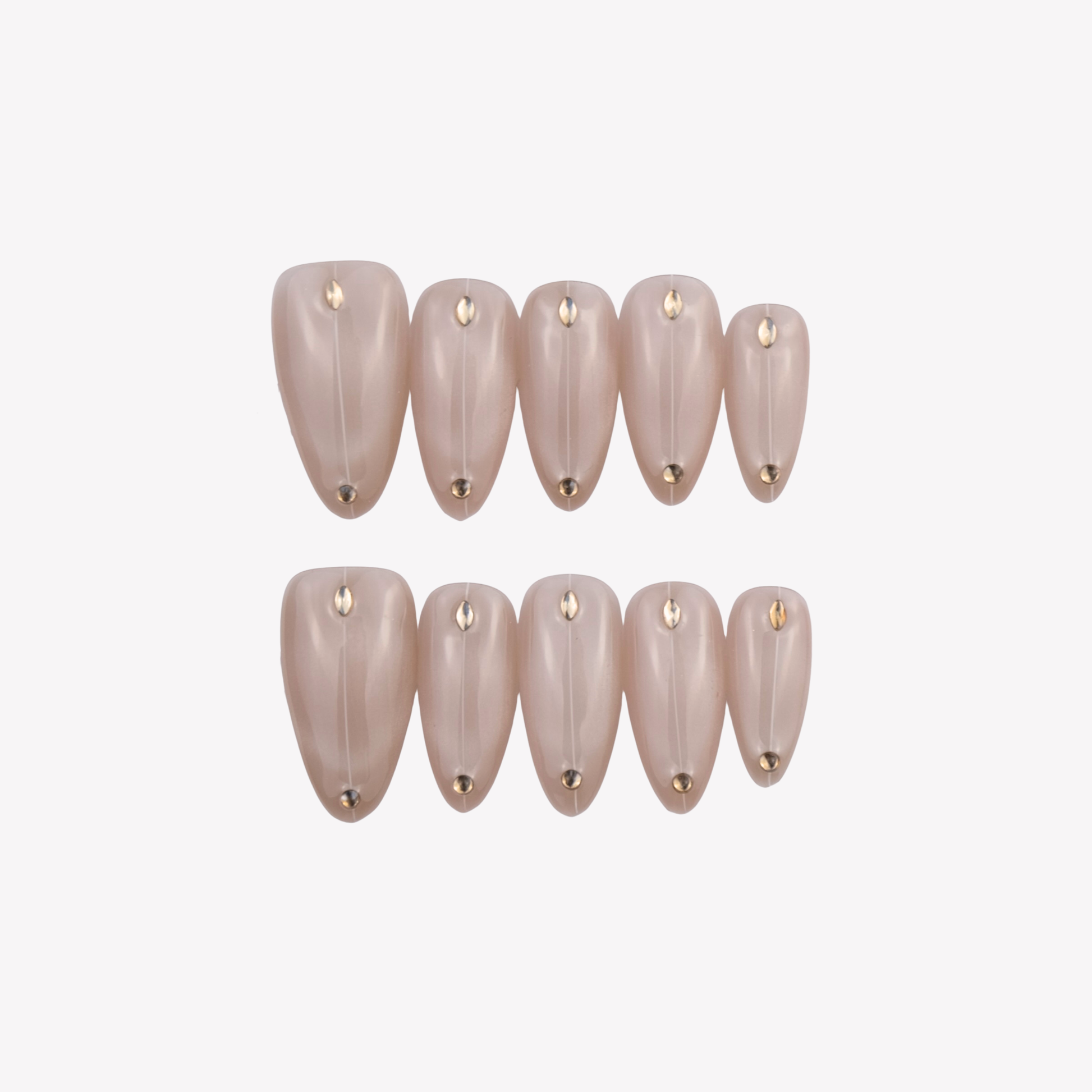 Sheer nude nail set featuring a clean vertical line design with subtle gold stud accents, finished in a smooth, glossy sheen.